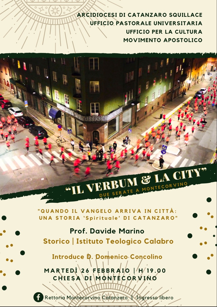 Si tratta di due appuntamenti che fanno parte del progetto di evangelizzazione “Il Verbum e la City” il cui obbiettivo principale è favorire il dialogo tra la fede cristiana e l’impegno per la costruzione umana e sociale della città in cui viviamo attraverso relazioni più giuste e più vere.Siamo consapevoli che il potere trasformante del Vangelo va sempre favorito.